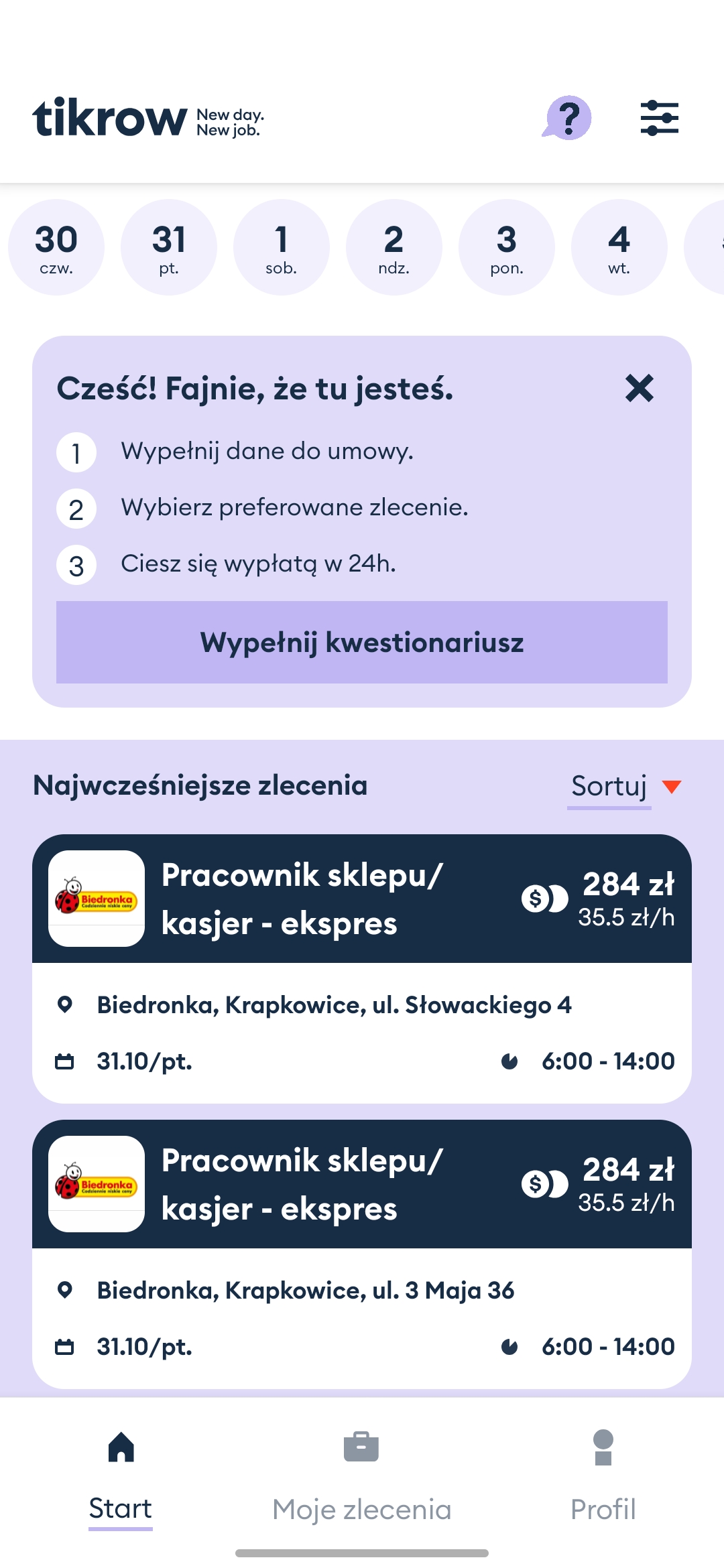 Niektóre stanowiska pracy np. kasjer wymagają badań SANEPID ale co ciekawe wiążąc się na dłużej z aplikacją Tikrow po 5 zrealizowanych zleceniach zwróci koszt orzeczenia. Świetna motywacja do podniesienia swoich kompetencji i uzyskania orzeczenia ale także czynnik utrzymujący użytkownika w aplikacji na dłużej co zwiększa stałe przywiązanie do platformy.
