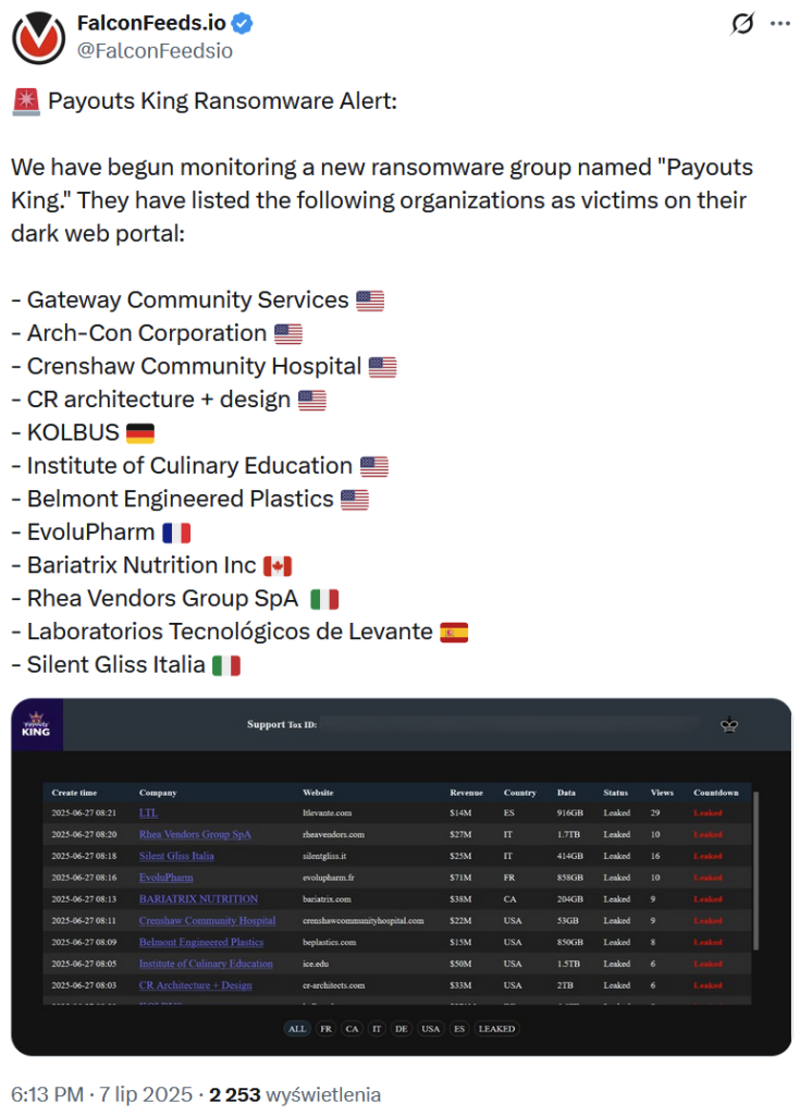 FalconFeeds.io ogłosiło istnienie nowej grupy hakerskiej wraz z całą listą pierwszych ofiar 7 lipca 2025.